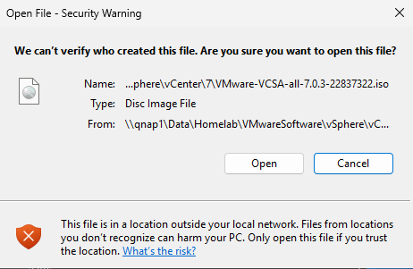 A confirmation window will appear before mounting. Select Open to proceed.