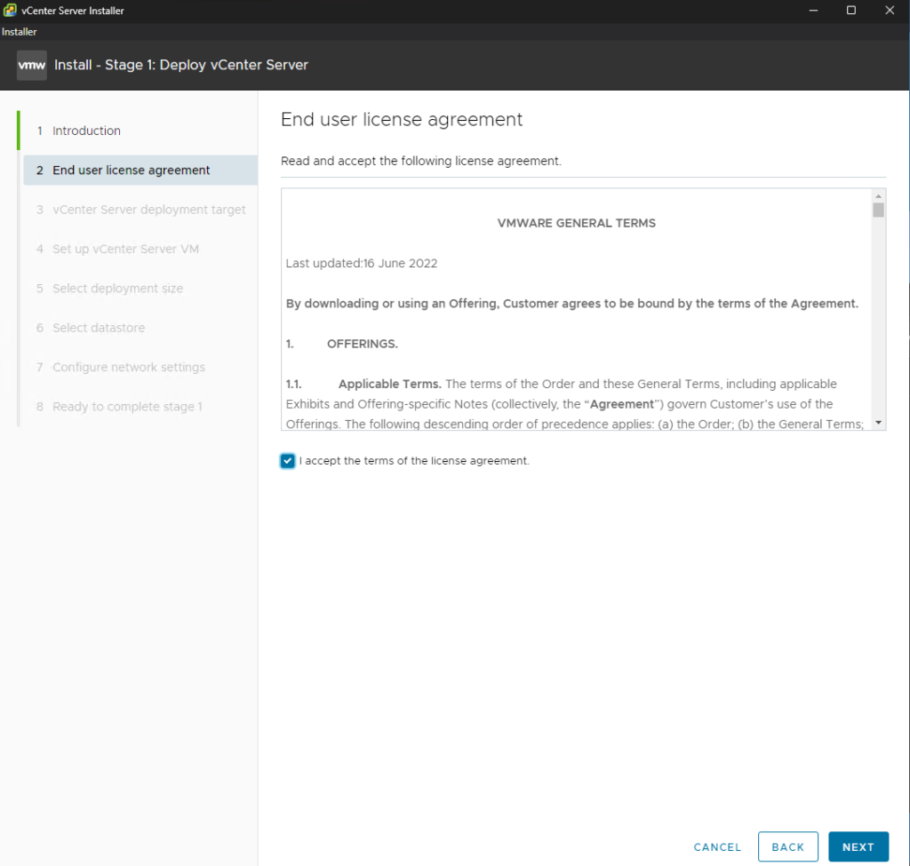 EULA: Review the license agreement, check the box to accept the terms, and select Next.