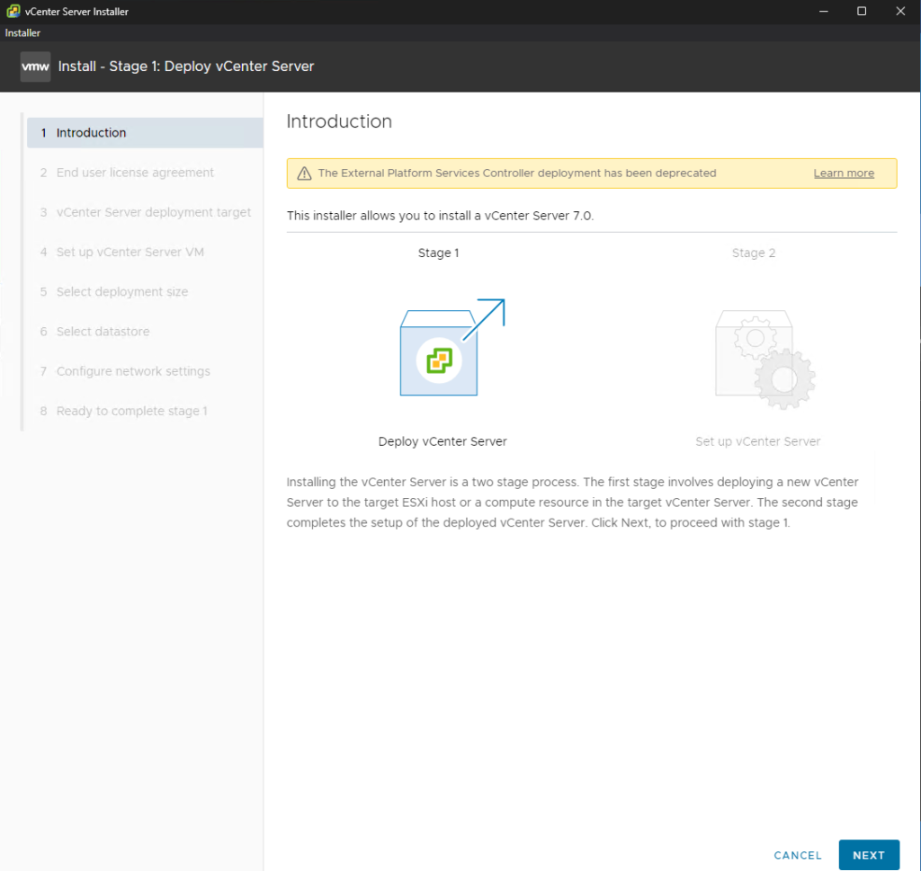 Greetings! Today we will be deploying vCenter Server Appliance (VCSA) 7. This is part of a series covering vCenter installation; this article focuses on using the standard ISO and its built-in executable launcher.