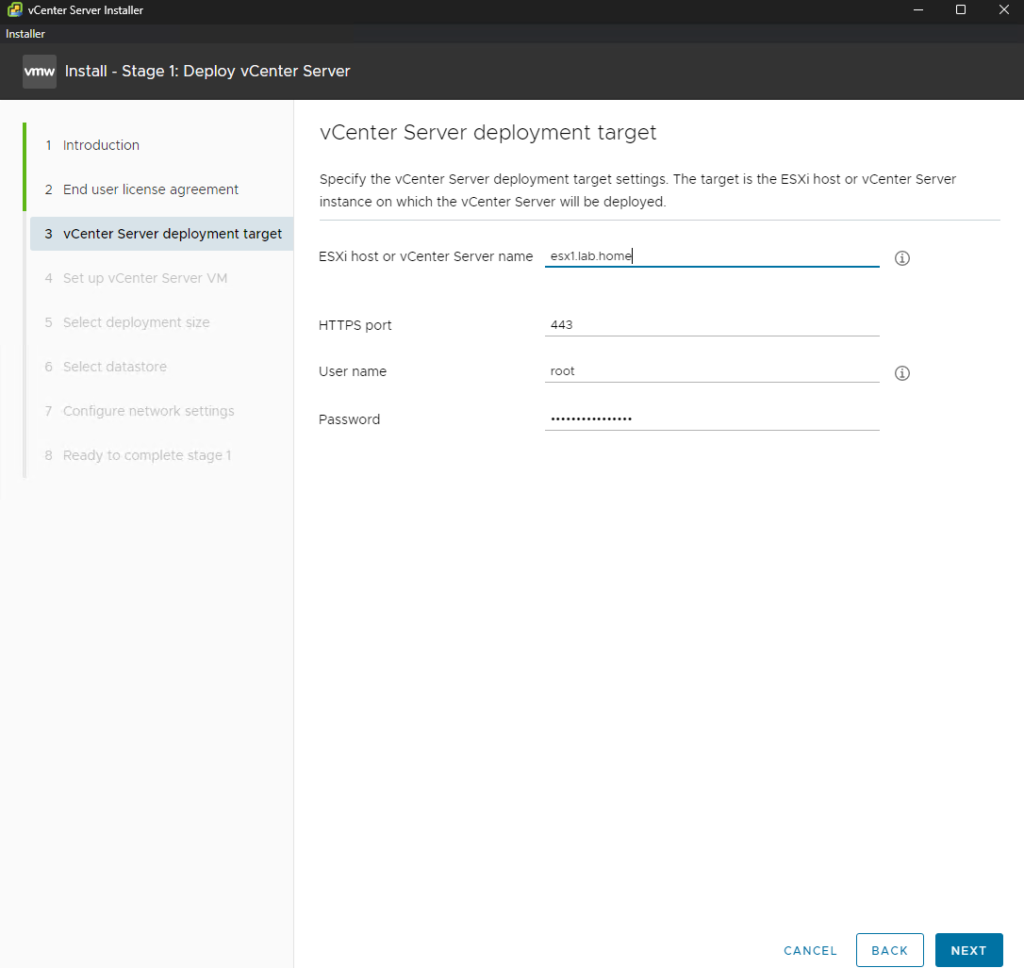 Appliance Deployment Target: Enter the FQDN or IP address of the ESXi host or vCenter Server that will manage the new appliance.