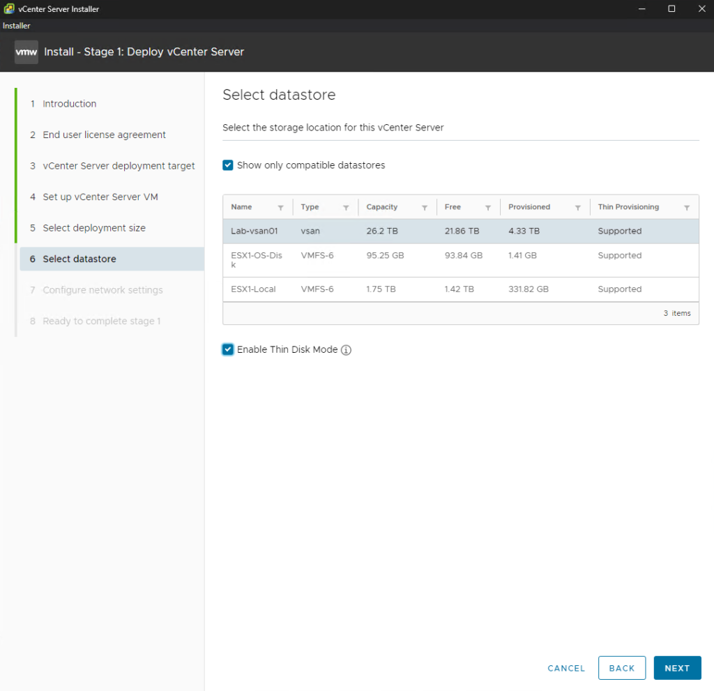 Select Datastore: Choose the storage where the VM will reside. If you are using an existing VCF 9 infrastructure, select that vSAN instance.