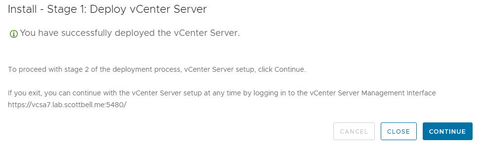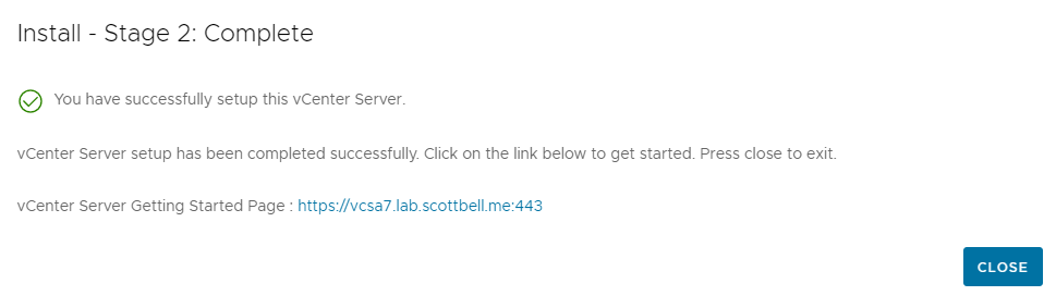 Once the process finishes, you will see a final success screen. You can now access your vCenter instance via your web browser.