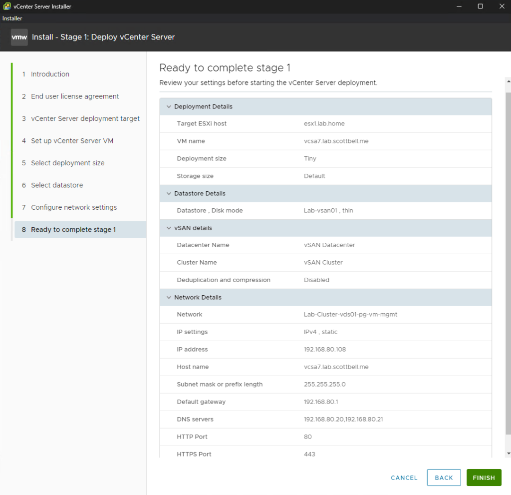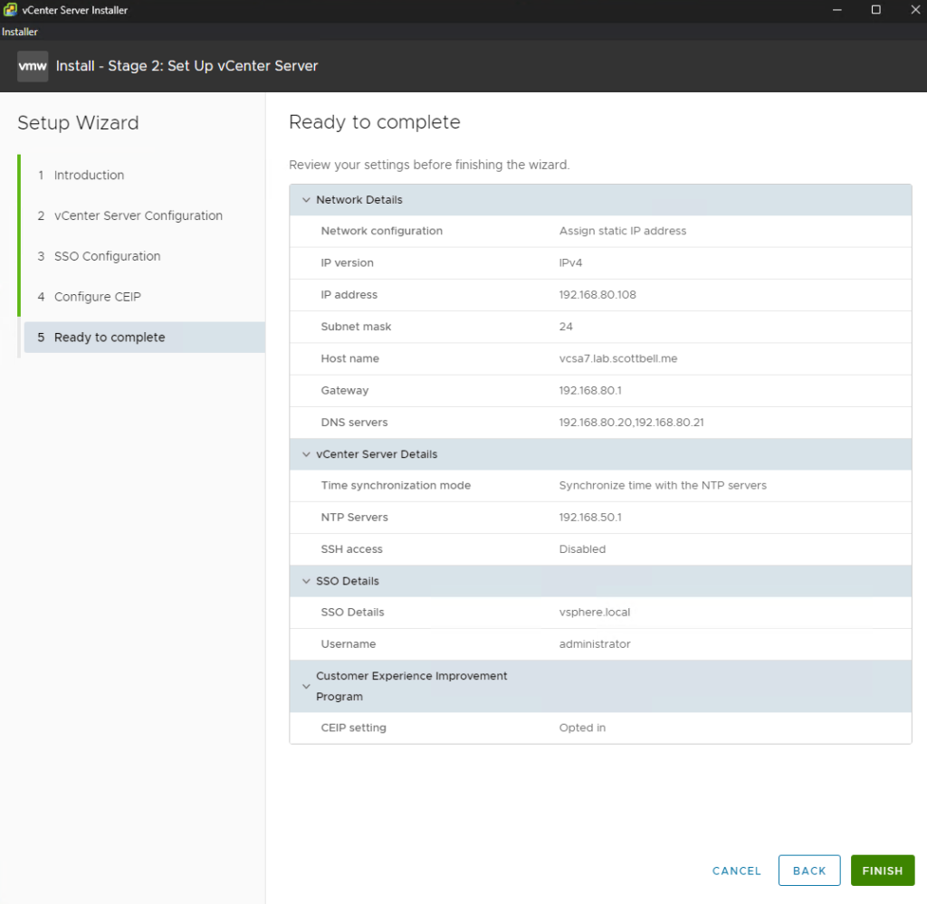 SSO Settings: Create your SSO password for the administrator@vsphere.local account.