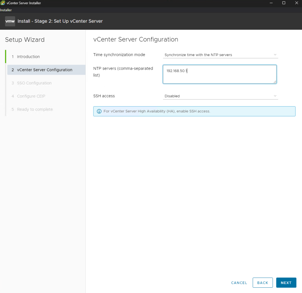 Appliance Configuration: Verify your settings. You have the option to configure NTP synchronization here. While some administrators prefer to set this post-install, it is recommended to enable it now to ensure there is no time drift during the SSO configuration.