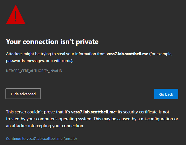 SSL Warning: Because the vCenter is using a default self-signed certificate, your browser will display a security warning. Verify the address is correct and select Continue.
