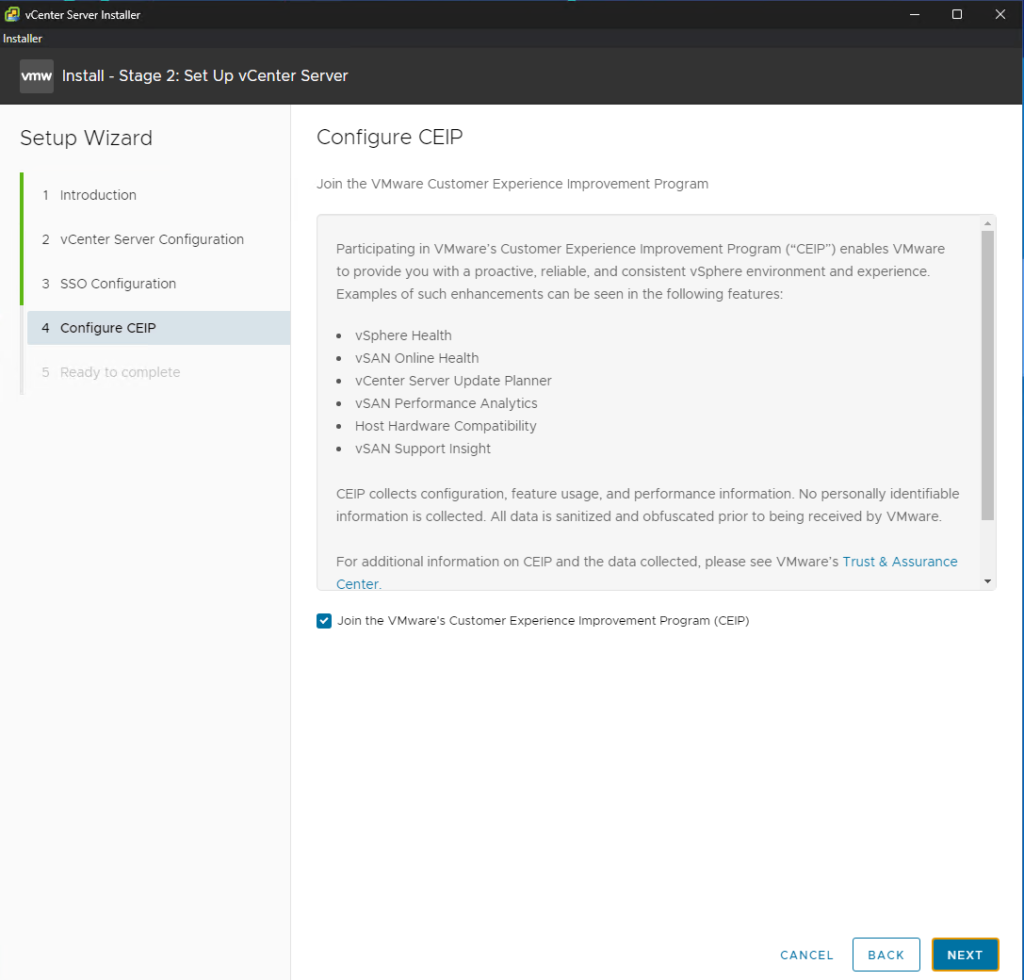 CEIP: Choose whether to participate in the Customer Experience Improvement Program and select Next.