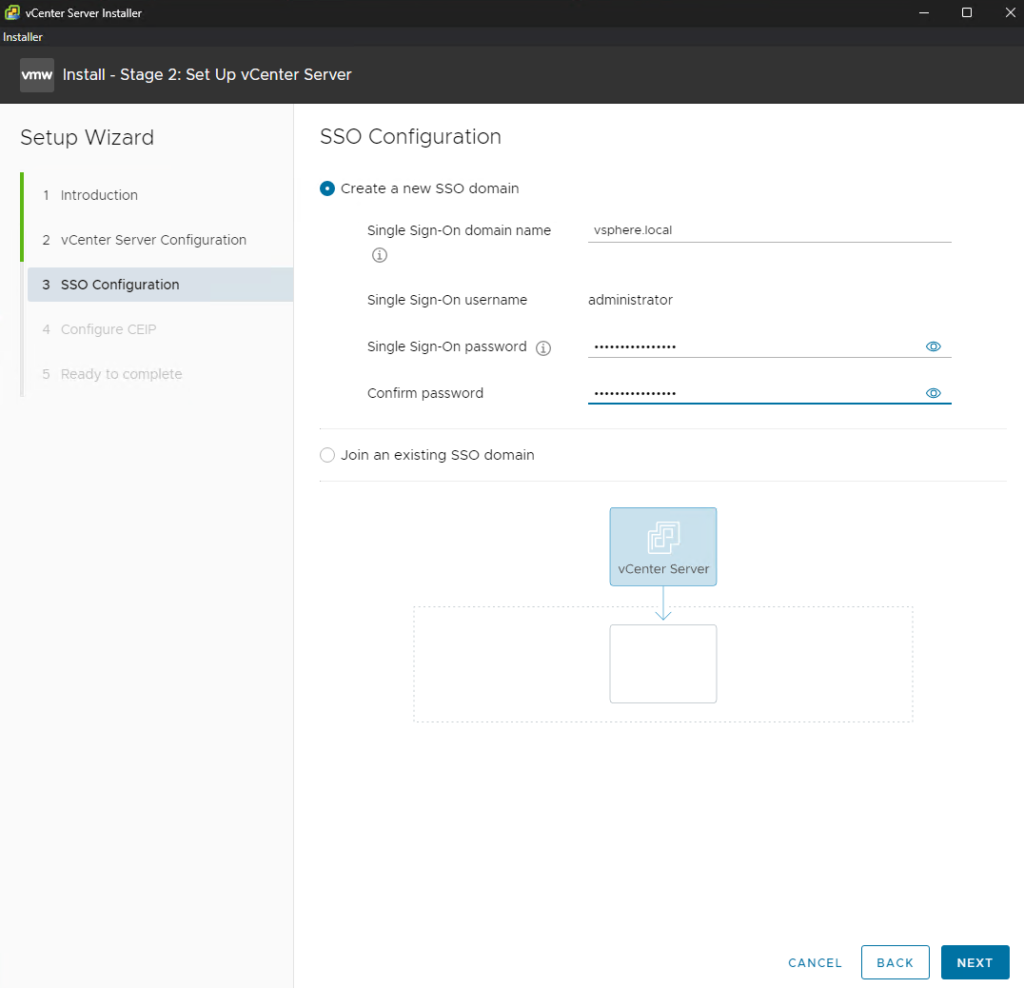 Note: You must manually type out the Single Sign-On domain name (vsphere.local). The field may show it as an example, but it is not filled in by default.