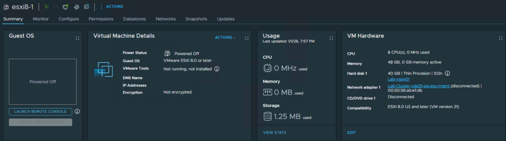 I have also attached the ESXi 8.03 ISO to the VM for this install. There are newer versions, but this works for one of the next articles for updating ESXi using vCenter 8’s Lifecycle Manager